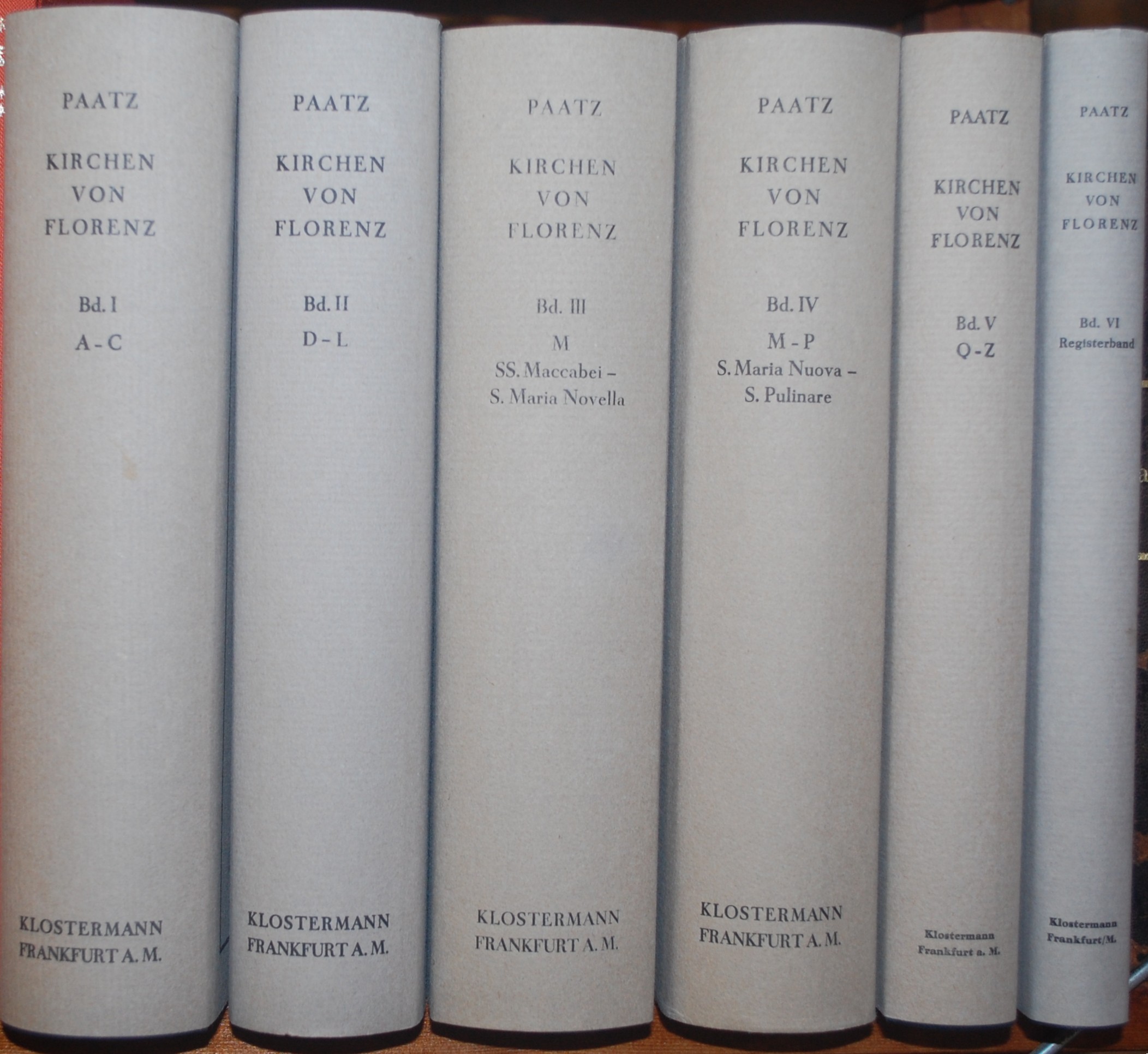 Paatz, Walter und Elisabeth. Die Kirchen von Florenz. Ein kulturgeschichtliches Handbuch. Mit zahlr. Grundrissen u. Plänen, teils gefaltet. 6 Bde. (incl. Register-Bd. mit 4 mehrf. gefalteten Stadtplänen). Frankfurt, Klostermann 1952-1955 Ca. 3600 S. OLn. m. verg. R.-Titel u. OU (nur diese teils minimal lichtrandig). Das über Jahre seit 1925 bearbeitete Mammutwerk versteht sich als kritisches Denkmälerinventar. In ersten Lieferungen erschien das Werk bereits ab 1939. – Offenbar ungelesen!