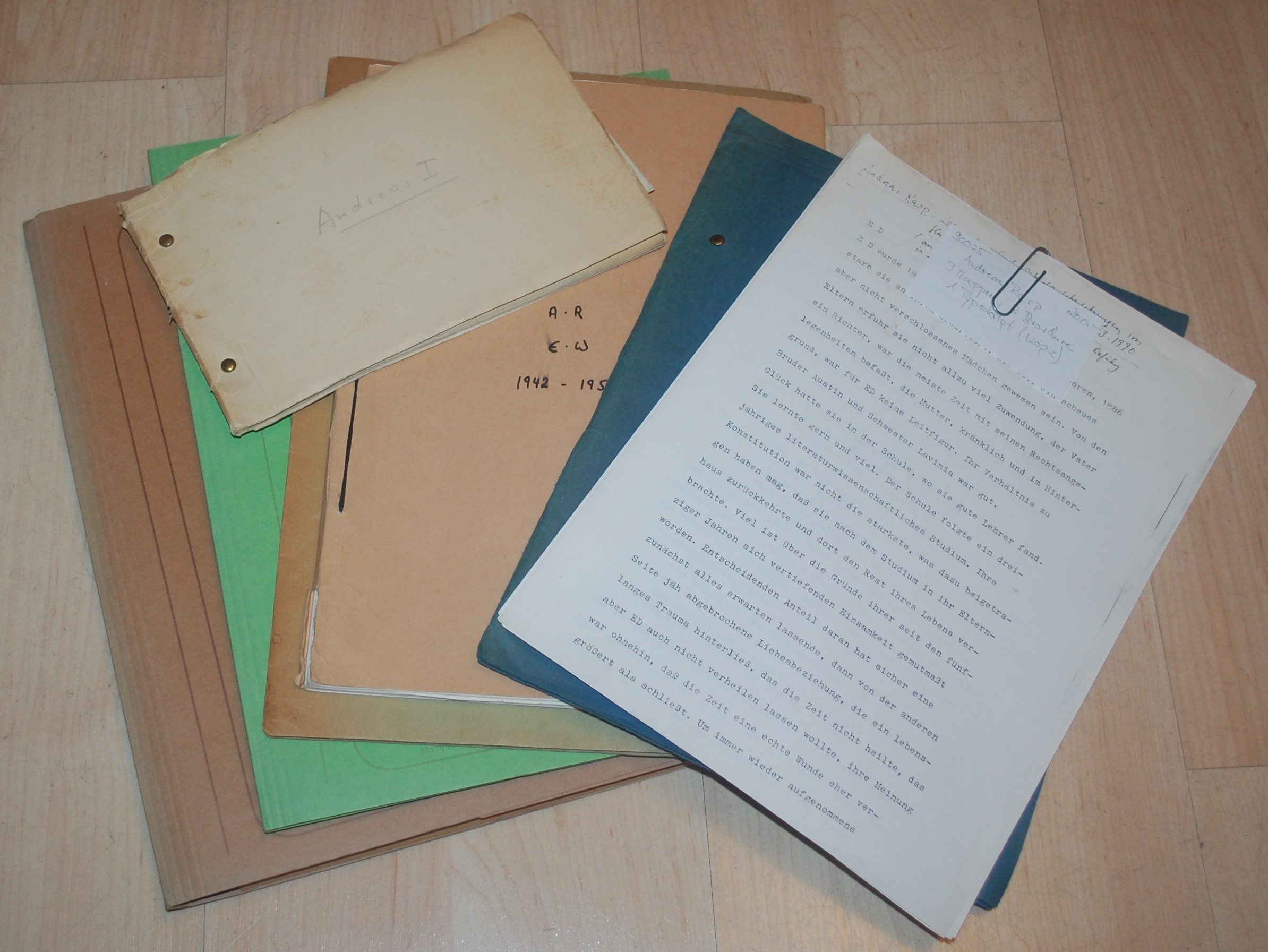 Rasp, Andreas. Schulbuch. – besuch bei dschuang dsi. verse. – Tyll. – Andreas I. – Andreas, Dritter Band. – Vortrag und Lesung zu Emily Dickinson. – Erd Wallace: Mit Andreas Rasp in London 1942-1952. Mit eingeklebten Originalfotos. 3 Mappen, 3 Broschuren, 1 Typoskript (Kopie). O.O. 1954-1995. 4°. 89, 26, 43, 77, 42, 23 u. 44 Bll. Mappen teils von Rasp handschriftl. beschriftet. 1. u. 2. im Originaltyposkript, 3. im Typoskript-Durchschlag mit handschriftl. Titel. 4. quer-8°. mit Klammer gebunden, Durchschlag. 5. mit Klammer gebunden, Durchschlag mit handschriftl. Überschriften. 6. Kopie einer Veranstaltung Rasps im Kurpfälz. Museum Heidelberg am 8.3.1990, in der Rasp aus seinen Emily Dickinson Übersetzungen vortrug und über sie sprach. 7. Der Titel von Erd Wallace, geschrieben 1981, existiert in nur 3 Exemplaren. – Andreas Rasp (1921-2013), 1937 ausgewandert nach England und zurückgekehrt 1952, war Lehrer am Englischen Institut in Heidelberg von 1955-1984, gehörte zum George-Kreis. Derartige Kopien seiner Gedichte wurden nur im Freundeskreis verteilt. Der „besuch“ wurde allerdings mittlerweile veröffentlicht.