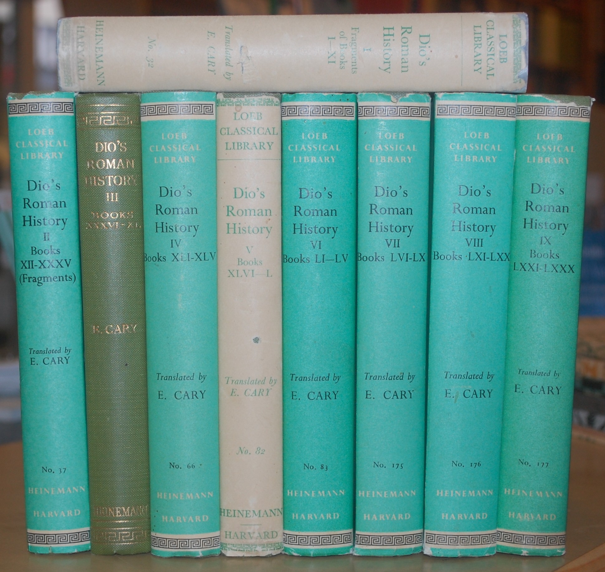 Dio (Cassius Cocceianus). Roman history. With an english translation by Earnest Cary. In nine Vol. (= Books I-LXXX). 9 Bde. (graece/engl.). Cambridge u. London, Harvard u. Heinemann 1954-70. Ca. 4620 S. OLn. m. verg. R.-Titel u. kl. D.-Vignette mit OU (nicht bei Bd.3). (Schnitt leicht fleckig, OU leicht berieben u. mit kl. Ein u. Ausrissen). Loeb Classical Library. – Papierbedingt minimal gebräunt, sonst sehr sauber.