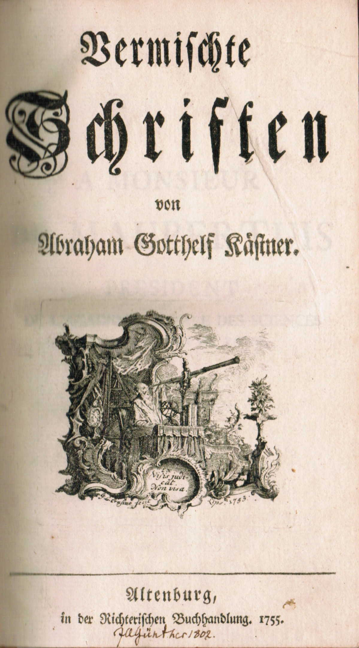 Kästner, Abraham Gotthelf. Vermischte Schriften. 2 Theile in 1 Bd. Altenburg, Richter 1755 u. 1772. 8 nn. Bll., 255)1) S. u. 12 nn. Bll., 278(2) S. Geflammtes Ldr. d. Zt. m. reicher Rverg. Erste Ausgabe. Wilp./. 27. Goed. IV 1, 42, 1. Der Mathematiker Kästner (1719-1800) war eine Doppelbegabung, Prof. für Mathematik, Philosophie und Jura in Leipzig, ab 1756 in Göttingen, – und Dichter. Seine zahlreichen Publikationen halten sich naturwissenschaftlich und dichterisch die Waage. Friedrich Gauß urteilte: „Kästner war unter den Dichtern seiner Zeit der beste Mathematiker, unter den Mathematikern seiner Zeit der beste Dichter.“ – Enthalten sind Lehrgedichte, Oden, Elegien, Fabeln, Sinngedichte, Parodien und lateinische Gedichte, sowie in Band 2 45 prosaische Aufsätze und 118 weitere Gedichte. – Mit dem handschriftlichen Besitzvermerk unter dem Druckvermerk von J(ohann), A(rnold). Günther (1755-1805), Jurist und Senator in Hamburg, der selbst zahllose, meist anonyme kleinere Schriften verfasste. Arnolds 8200 Bände umfassende Bibliothek, die testamentarisch der Patriotischen Bibliothek vermacht worden war, ist 1842 beim Hamburger Brand zum großen Teil vernichtet worden. – Gelegentlich etwas stockfleckig, sonst aber sehr gutes und schönes Exemplar.