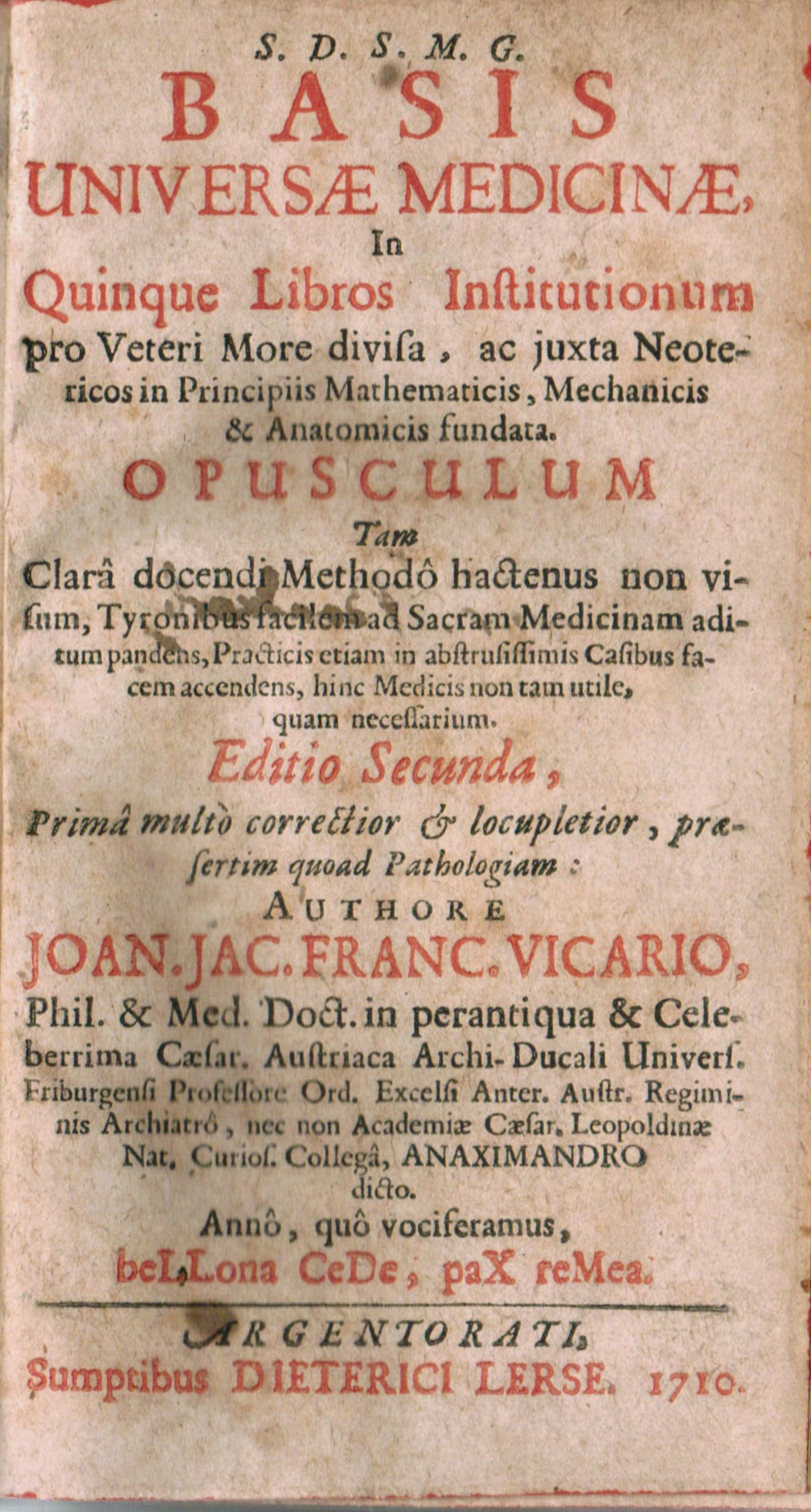 Vicarius, Joan. Jac. Franc. Basis universae medicinae, In Quinque Libros Institutionum pro Veteri More divisa, ac juxta Neotericos in Principiis Mathematicis, Mechanicis & Anatomicis fundata. Opusculum Tam Clara docendi Methodo hactenus… Ed. Secunda. Argentorati (= Straßburg), Dietrich Lerse 1710. Kl.-8°. 7 Bll., 380 S., 6 Bll. (Register). Etwas späterer Ppbd. (etwas berieben u. fleckig). Poggendorff II, 1201. Hirsch VI, 104. – Vicarius (1664 – ?) war zunächst Physicus zu Waldshut, später Professor der Medizin in Konstanz, zur Zeit des Erscheinens dieses Bandes Professor in Freiburg. Die erste Augabe war 1700 in Ulm erschienen. – Etwas stockfleckig, gelegentlich etwas gebräunt.