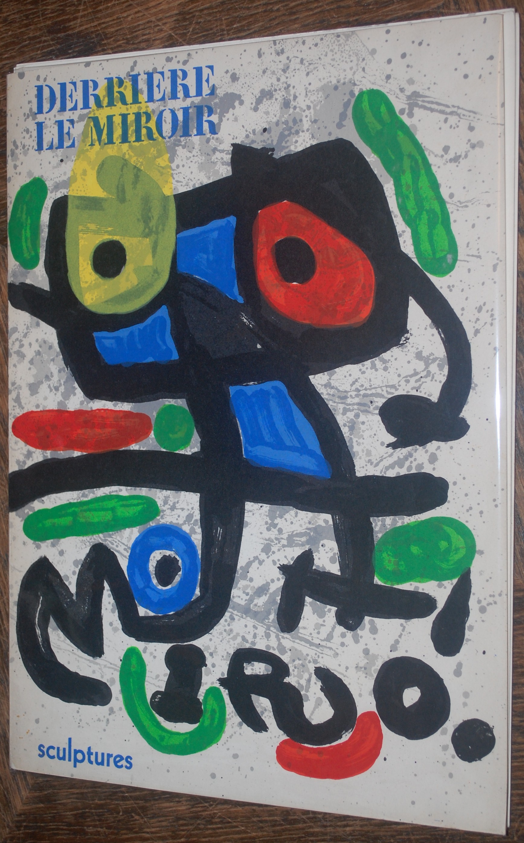 Derriere le Miroir – Miró – Balthazar, André. Les culptures de Miró. Und: Miró sculpteur par Jacques Dupin. Mit 32 s./w. Abb. u. 8 s./w. Textabb., 6 farb. Lithographien (davon 2 Doppel-S.) u. 2 gefalt. Orig.-Lithographien (S. 10/11 u. OU). Paris, Maeght Editeur 1970. Folio. (38 x 28 cm). 30 S. Farb. illustr. OU (minimal berieben, bestoßen, lichtrandig, fleckig u. gebräunt, Kapitale leicht gestaucht u. mit kl. Einrissen, Rücken mit 8cm langen Einriß). Derriere le Miroir No. 186. – Bis auf die leichten Läsuren des OU innen sehr gut erhalten.