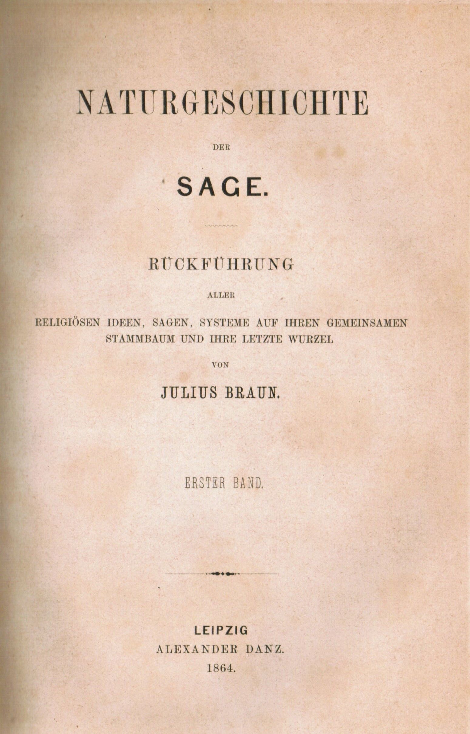 Braun, Julius. Naturgeschichte der Sage. Rückführung aller religiösen Ideen, Sagen, Systeme auf ihren gemeinsamen Stammbaum und ihre letzte Wurzel. 2 Bde. (in 1 Bd.). Mit einem Holzschnitt. Leipzig, Alexander Danz 1864-1865. IV, 444 u. VII(1), 475(1) S. HLdr. d. Zt. mit verg. R.-Fileten (Gelenke und Rücken etwas beschabt, Hintergelenk zur Hälfte eingerissen, aber kompakt). DBE 2, 83. Vorliegende Naturgeschichte der Sage gilt als das Hauptwerk Brauns (1825-1869), der in den 50er Jahren eine umfangreiche Studienreise nach Ägypten und Syrien unternahm. Zunächst in Heidelberg und Tübingen, Anfang der 60er Jahre in München war er Professor für Philologie. „Das gegenwärtige Werk unternimmt es einen Ordnungsplan aufzustellen für das ganze unermessliche Chaos der menschlichen Ideenwelt in allen Sagen, Systemen, Religionen von Island bis Äthiopien, Indien und Mexiko hinüber.“ (Einleitung). Er behandelt Kronosformen, Typhonformen, Agathodämonformen, Rhea-IsisFormen u.a. – Gering gebräunt.